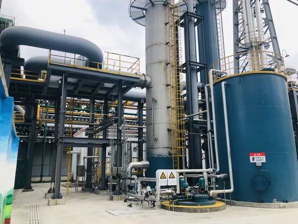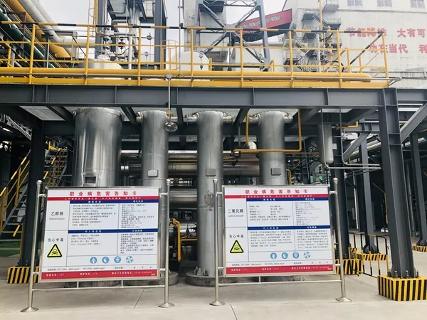 富液從再生塔上部和中部分流進入,通過汽提解吸部分CO2,然后進入再沸器,使其中的CO2進一步解吸。解吸CO2后的貧液由再生塔底流出,經閃蒸罐閃蒸出部分蒸汽加壓回收回到解吸塔回收熱量;閃蒸罐流出貧液經貧富液換熱器回收熱量后,用泵送至貧液冷卻器,冷卻后進入吸收塔。溶劑往返循環構成連續吸收和解吸CO2的工藝過程,CO2的捕集率在90%以上。